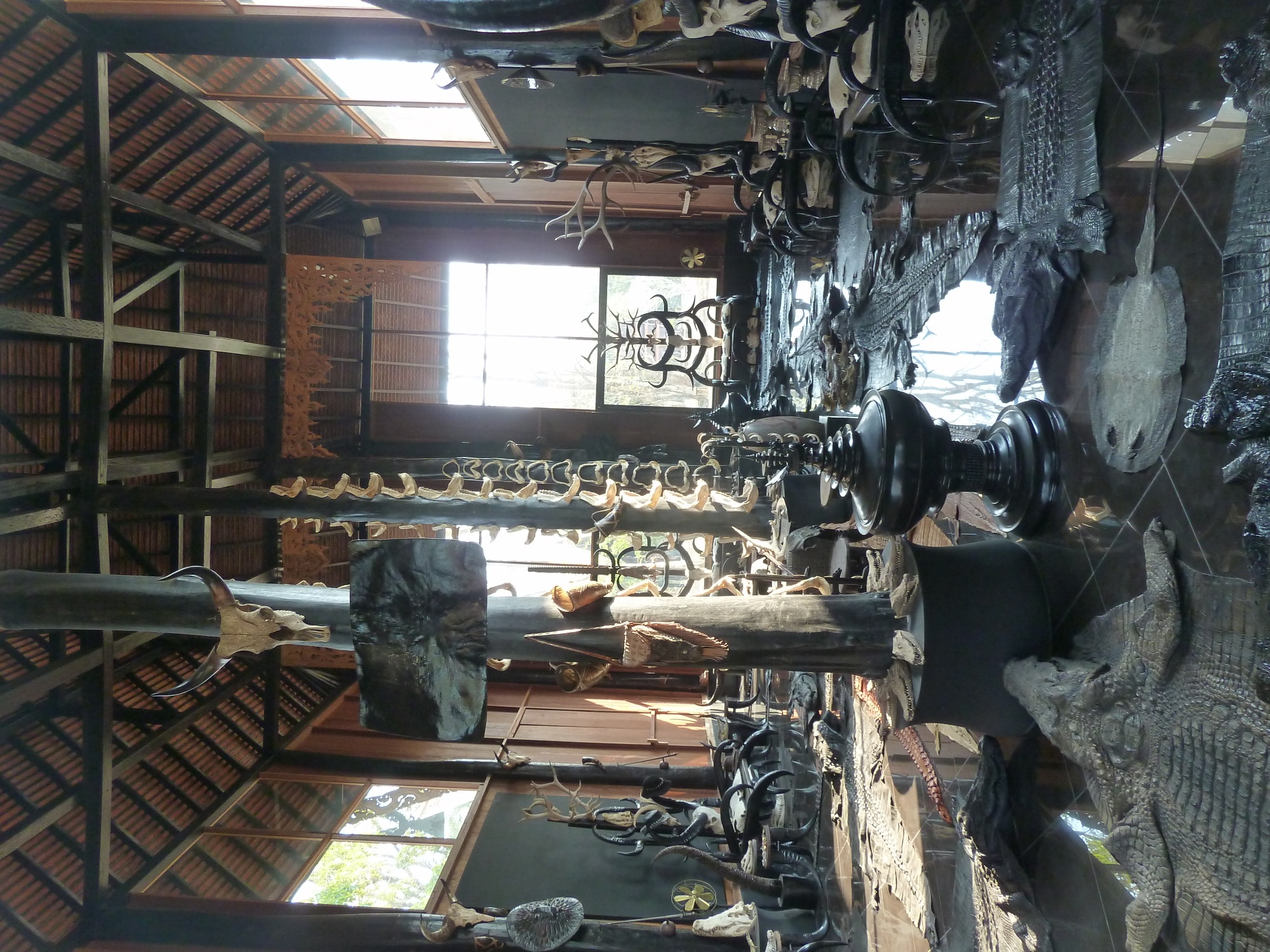 Une transition toute trouvée disais-je, car outre les bâtiments à dominance noire comme vous l’aviez subtilement deviné, le design intérieur est composé quasiment exclusivement d’animaux morts : peaux, fourrures, os, crânes, squelettes entiers, cornes, défenses, coquillages. Un petit paradis pour notre Brigitte nationale. Enfin, comme vous savez que je ne me lancerai sûrement pas dans une diatribe sur la chasse et l’extinction des espèces, je laisse aux curieux le soin d’admirer ce travail d’artiste que j’ai beaucoup apprécié. C’est original et esthétiquement souvent réussi malgré le fouillis.